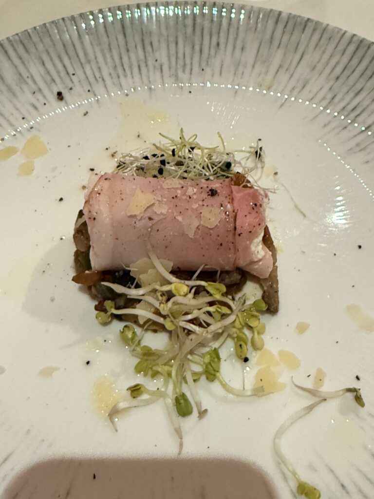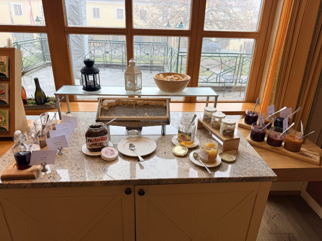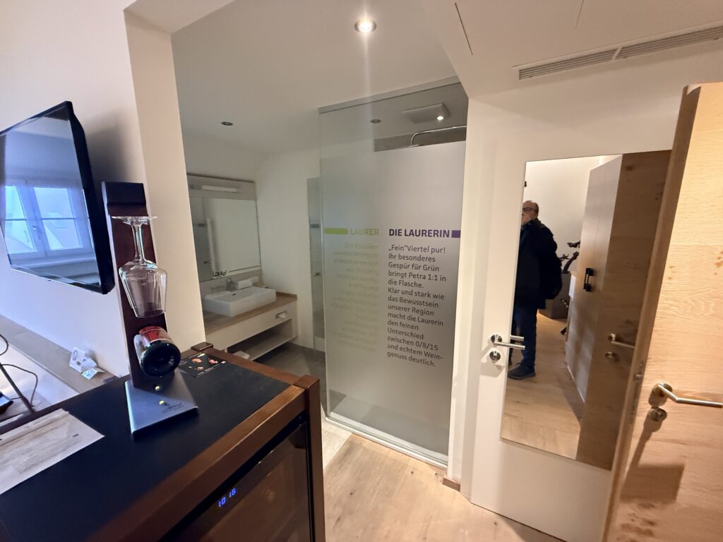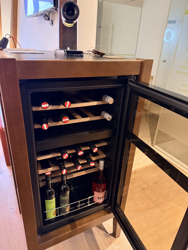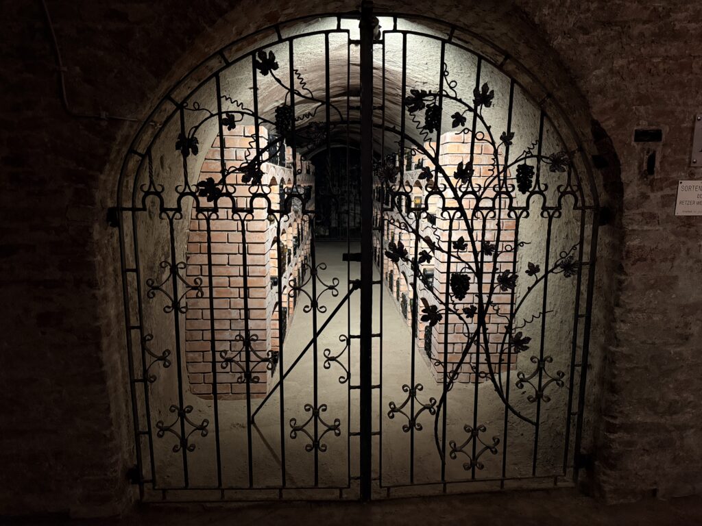Das Frühstück und das Essen im Hotel waren sehr gut. Im Restaurant wird dem Wein in Kombination mit ausgezeichneter Kulinarik eine besondere Bühne gegeben. Den krönenden Abschluss bildete die hauseigene Gebietsvinothek Retzer Land. Mit über 350 Weinen von mehr als 90 Winzern bietet sie die größte regionale Wein- und Winzervielfalt in Niederösterreich. Was schmeckt, nimmt man zum Preis wie beim Winzer mit. Wir kauften für zu Hause einen Blauen Portugieser aus Retz – jenen Wein, der angeblich 1955 zur Unterzeichnung des österreichischen Staatsvertrags gereicht wurde. Ein passender Abschluss!